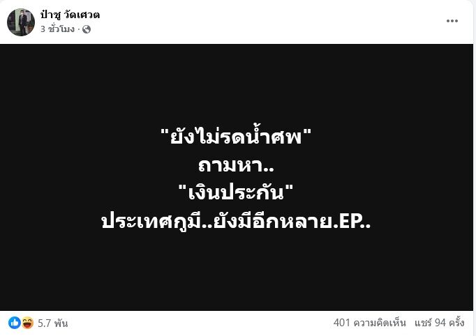 ป๋าชู ยังโพสต์ข้อความซัดแรงอีกหลายโพสต์ด้วย อาทิ ““ยังไม่รดน้ำศพ” ถามหา.. “เงินประกัน” ประเทศกูมี..ยังมีอีกหลาย.EP..” ท่ามกลางคอมเมนต์วิพากษ์วิจารณ์ร้อนแรง ต่างๆ นานา