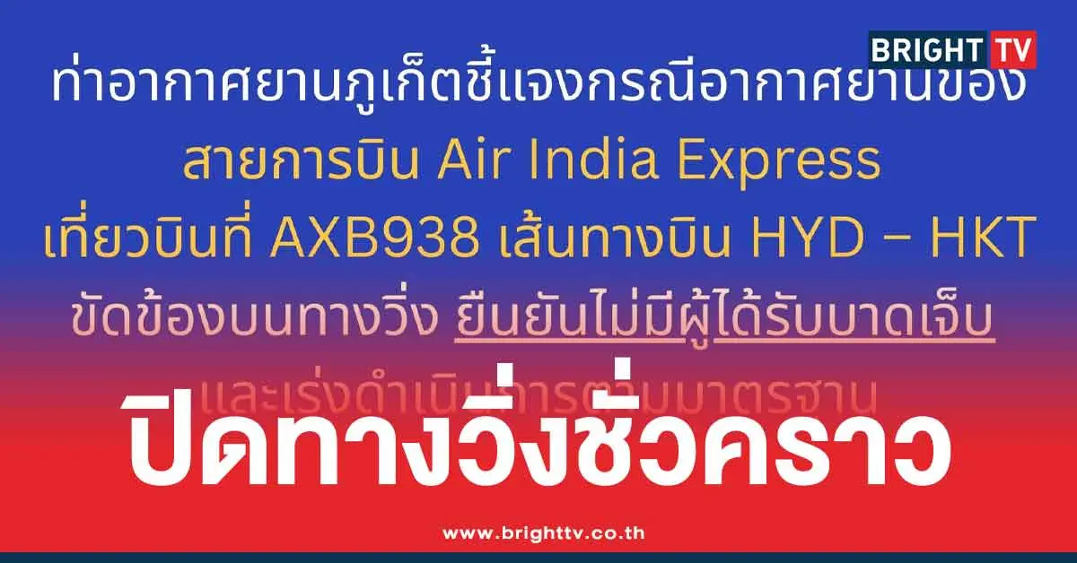 แจ้งผู้ใช้บริการ สนามบินภูเก็ต ปิดทางวิ่งเป็นการชั่วคราวถึง 6 โมงเย็น หลังเครื่องบิน Air India เกิดเหตุขัดข้องบนทางวิ่งหลังการลงจอด