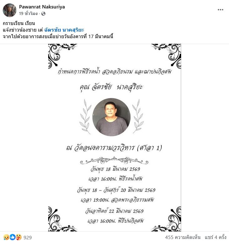 เมื่อวันที่ 17 มี.ค.69 เหมี่ยว ปวันรัตน์ โพสต์เศร้าแจ้งข่าวสูญเสียน้องชาย เต๋ ฉัตรชัย นาคสุริยะ โดยเผยกำหนดการพิธีรดน้ำ และ ฌาปนกิจศพ พร้อมแคปชั่นด้วยว่า