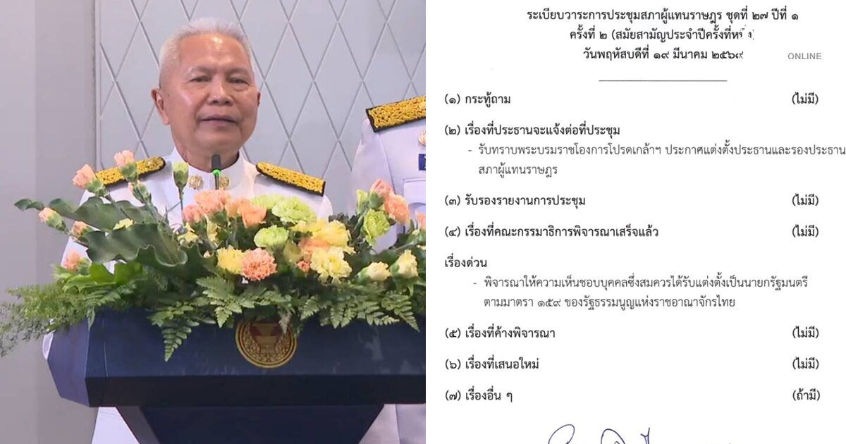 สภาฯ บรรจุวาระโหวต ‘นายกรัฐมนตรี’ วันที่ 19 มี.ค. เวลา 10.00 น.เป็นต้นไป