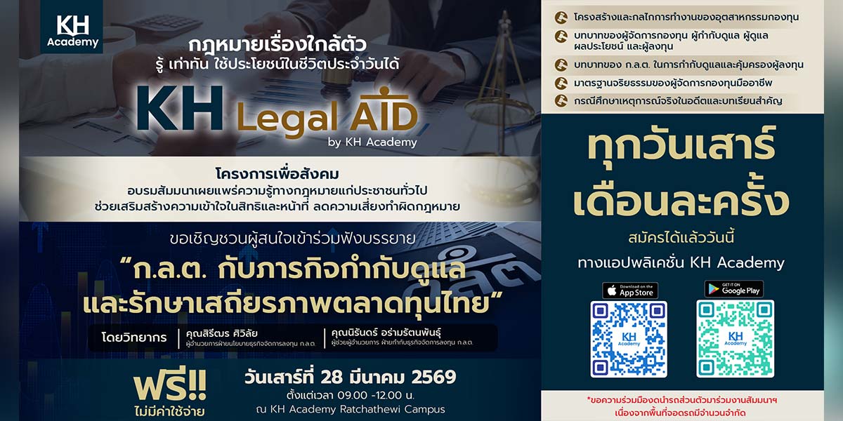 สำหรับโครงการ KH Legal Aid ประจำเดือนมีนาคมนี้ ขอเชิญชวนนิสิต นักศึกษา และบุคคลทั่วไป มาร่วมเจาะลึกบทบาทการทำงานขององค์กรที่มีหน้าที่กำกับดูแลตลาดทุนไทย ภายใต้หัวข้อ “ก.ล.ต. กับภารกิจกำกับดูแลและรักษาเสถียรภาพตลาดทุนไทย” โดยได้รับเกียรติจากวิทยากรผู้ทรงคุณวุฒิจากสำนักงานคณะกรรมการกำกับหลักทรัพย์และตลาดหลักทรัพย์ (ก.ล.ต.) ได้แก่ คุณสิรีฒร ศิวิลัย ผู้อำนวยการ ฝ่ายนโยบายธุรกิจจัดการลงทุน และคุณนิรันดร์ อร่ามรัตนพันธุ์ ผู้ช่วยผู้อำนวยการ ฝ่ายกำกับธุรกิจจัดการลงทุน มาร่วมถ่ายทอดองค์ความรู้แบบเอ็กซ์คลูซีฟ