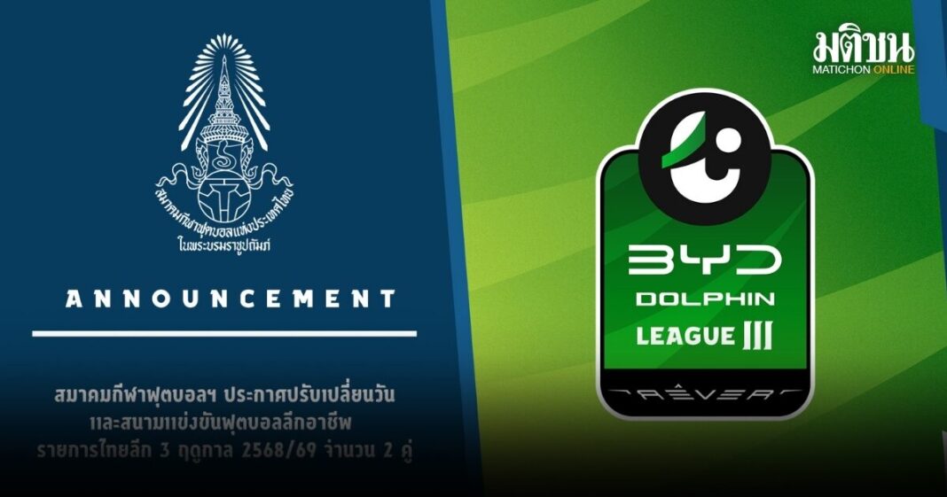 สมาคมกีฬาฟุตบอลแห่งประเทศไทยฯ ประกาศปรับเปลี่ยนวันและสนามแข่งขันฟุตบอลลีกอาชีพ รายการไทยลีก 3 ฤดูกาล 2568/69 จำนวน 2 คู่ ได้แก่