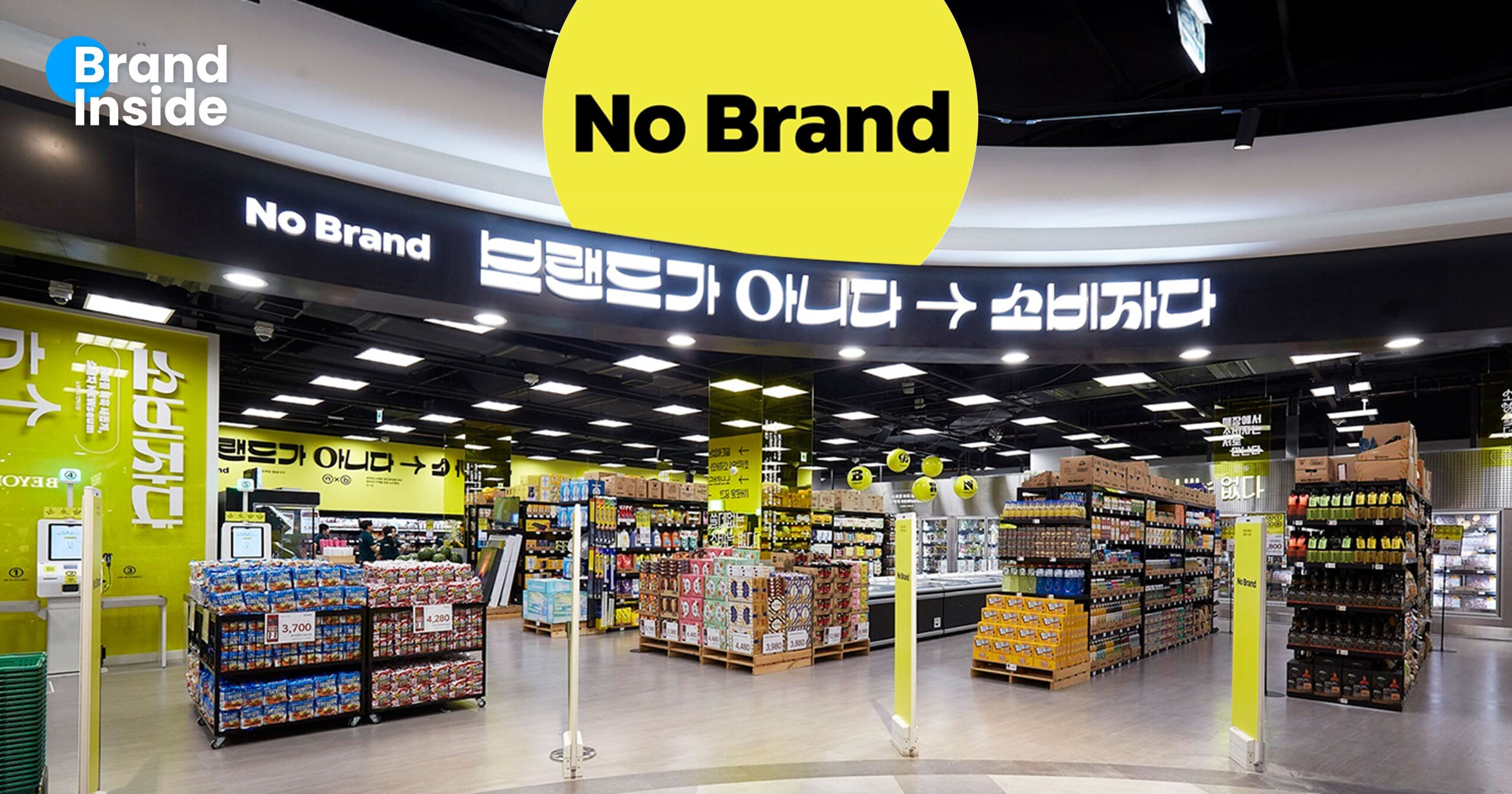 แต่ความพิเศษของ No Brand คือขายแต่สินค้า ‘ไม่มีแบรนด์’ หรือสินค้าทุกชิ้นจะมาตีตรา No Brand ซึ่งเป็นสินค้าของซูเปอร์มาเก็ตเอง (Own Brand) ทำให้สินค้าทุกชิ้นมีดีไซน์เรียบๆ จดจำง่าย ด้วยแพ็คเกจจิ้งสีเหลืองดำ และขายได้ในราคาถูกกว่าร้านค้าทั่วไป