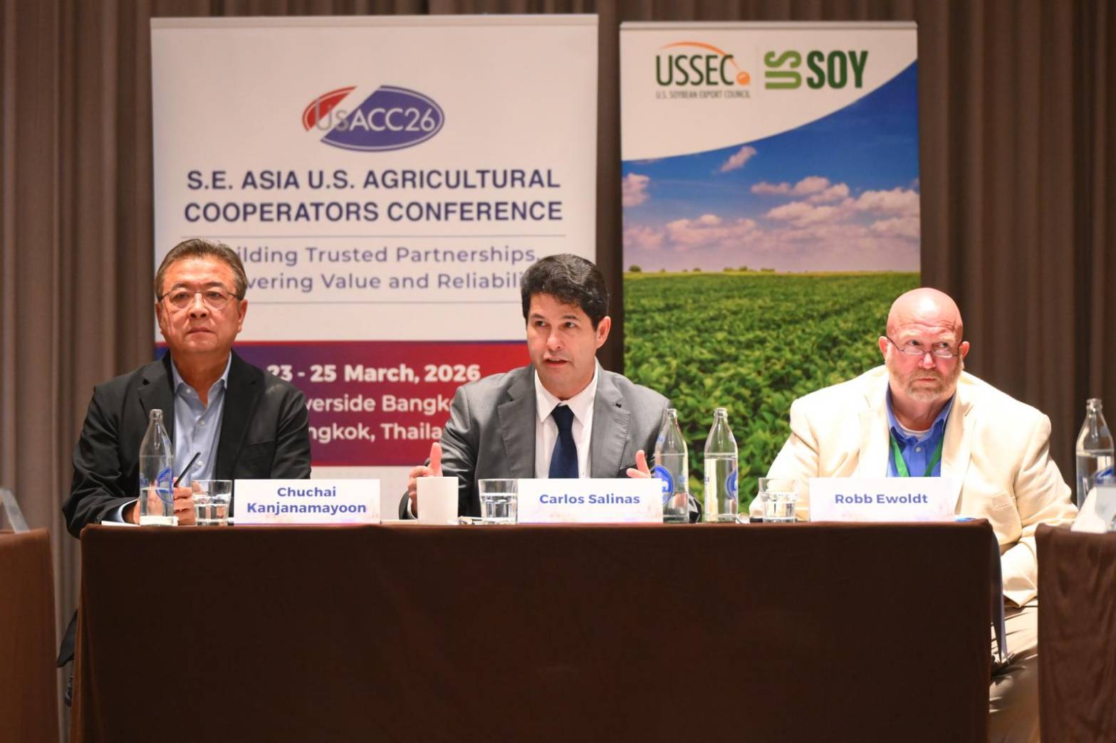 ผู้สื่อข่าวรายงานว่า ภาคอุตสาหกรรมอาหาร อาหารสัตว์ และการค้าเกษตรของเอเชียตะวันออกเฉียงใต้ ได้รวมตัวกันที่กรุงเทพฯ เพื่อเข้าร่วมสองงานสำคัญของอุตสาหกรรม ซึ่งจัดโดยสมาคมส่งออกถั่วเหลืองแห่งสหรัฐอเมริกา (U.S. Soybean Export Council – USSEC) ได้แก่ งาน S.E. Asia U.S. Agricultural Cooperators Conference และ Asia Soy Excellence & Food Summit โดยทั้งสองงานได้รวบรวมเกษตรกร ผู้ส่งออก ผู้นำอุตสาหกรรมจากสหรัฐฯ และผู้มีส่วนเกี่ยวข้องในภูมิภาค มาร่วมแลกเปลี่ยนข้อมูลเชิงลึก เสริมสร้างความร่วมมือ และสำรวจโอกาสใหม่ๆ ที่จะกำหนดทิศทางอนาคตของอุตสาหกรรมอาหารและการเกษตรในเอเชียตะวันออกเฉียงใต้