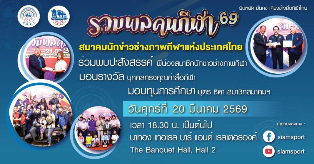 งาน “รวมพลคนกีฬา 2569” ของสมาคมนักข่าวช่างภาพกีฬาฯ วันศุกร์ที่ 20 มีนาคม นี้ ที่สวนอาหารนาทอง สมาคมฯเชิญชวนสมาชิกพาบุตร-ธิดามารับทุนการศึกษาโดยพร้อมเพรียงกัน มีของแจกของแถมมากมาย รวมทั้งรางวัลสื่อมวลชนทรงคุณค่า 3 รางวัล , การจับสลากแจกของรางวัลที่มีมูลค่ารวม 2-3 แสนบาท