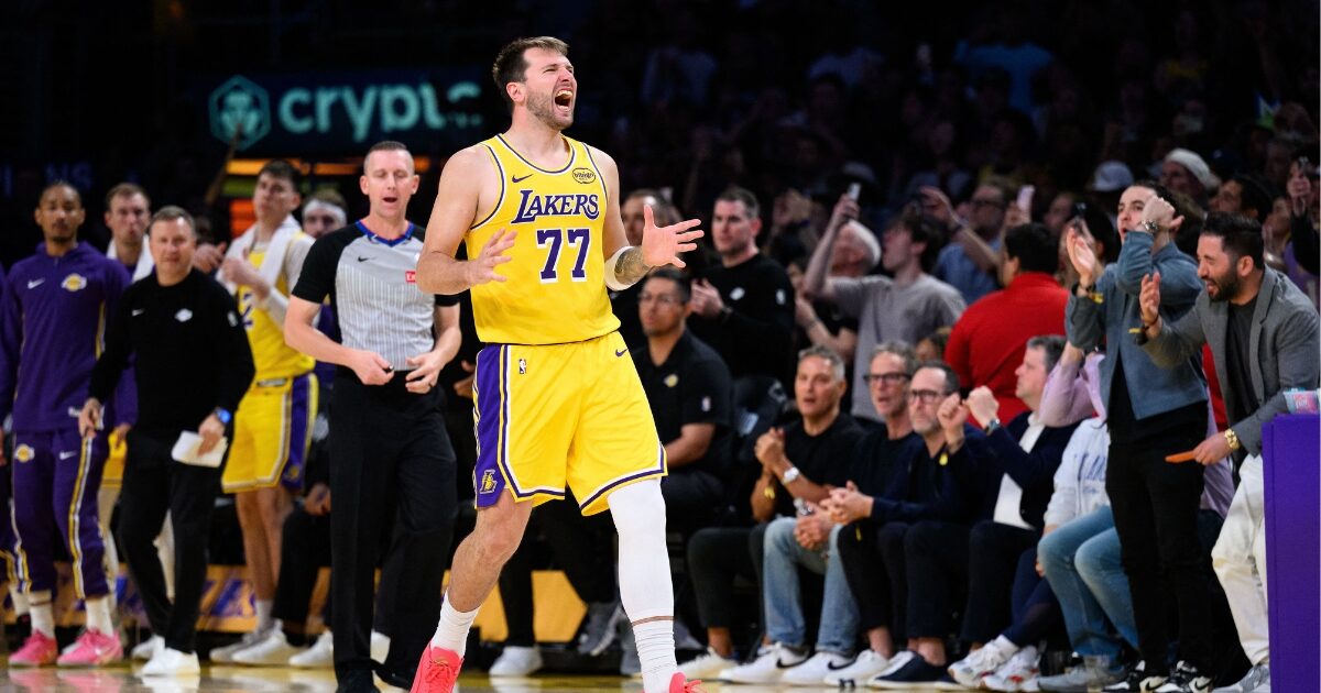 ลูก้า ดอนชิช ทำแต้มสำคัญในช่วง 0.5 วินาทีสุดท้าย พาแอลเอ เลเกอร์ส ชนะ เดนเวอร์ นักเกตส์ 127-125 ในการแข่งขันบาสเกตบอลเอ็นบีเอ ที่คริปโต ดอท คอม อารีน่า เมื่อวันที่ 14 มีนาคม