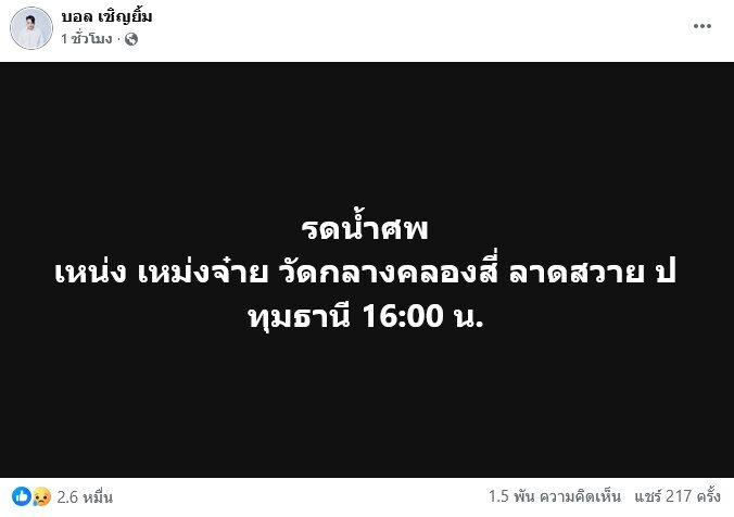 โดย บอล เชิญยิ้ม โพสต์ข้อความแจ้งว่า “รดน้ำศพ เหน่ง เหม่งจ๋าย วัดกลางคลองสี่ ลาดสวาย ปทุมธานี 16:00 น.” ท่ามกลางคอมเมนต์แฟนคลับเข้าร่วมแสดงความเสียใจร่วมอาลัยล้นหลาม