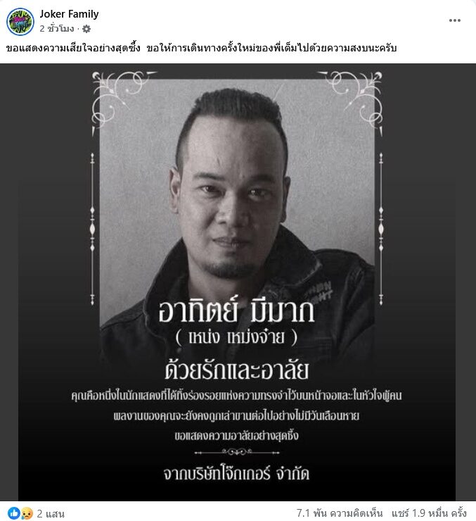 ขณะที่ Joker Family ก็โพสต์ข้อความอาลัย เหน่ง เหม่งจ๋าย หรือ อาทิตย์ มีมาก ว่า “ขอแสดงความเสียใจอย่างสุดซึ้ง ขอให้การเดินทางครั้งใหม่ของพี่เต็มไปด้วยความสงบนะครับ”