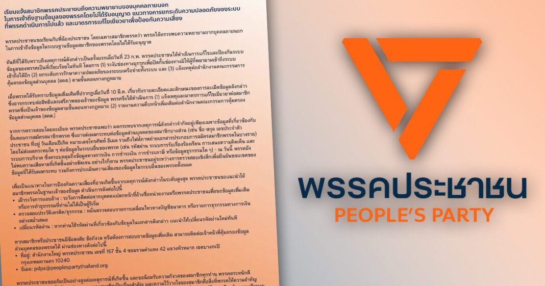 พรรคประชาชนขอเรียนกับพี่น้องประชาชน โดยเฉพาะสมาชิกพรรคว่า พรรคได้ตรวจพบความพยายามจากบุคคลภายนอกในการเข้าถึงข้อมูลในระบบฐานข้อมูลสมาชิกของพรรคโดยไม่ได้รับอนุญาต