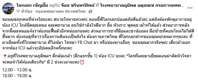 “พี่โยกเยกฝากขอบคุณทุกคนมากๆนะคะ ที่มาเยี่ยมทั้งที่โรงพยาบาล ที่ไลน์มา โทรมา FB Chat มา หรือช่องทางอื่นๆ ขอบคุณมากจริงๆค่ะ เดี๋ยวถ้าออกจากห้อง ICU แล้วจะอัปเดตอีกครั้งนะคะ