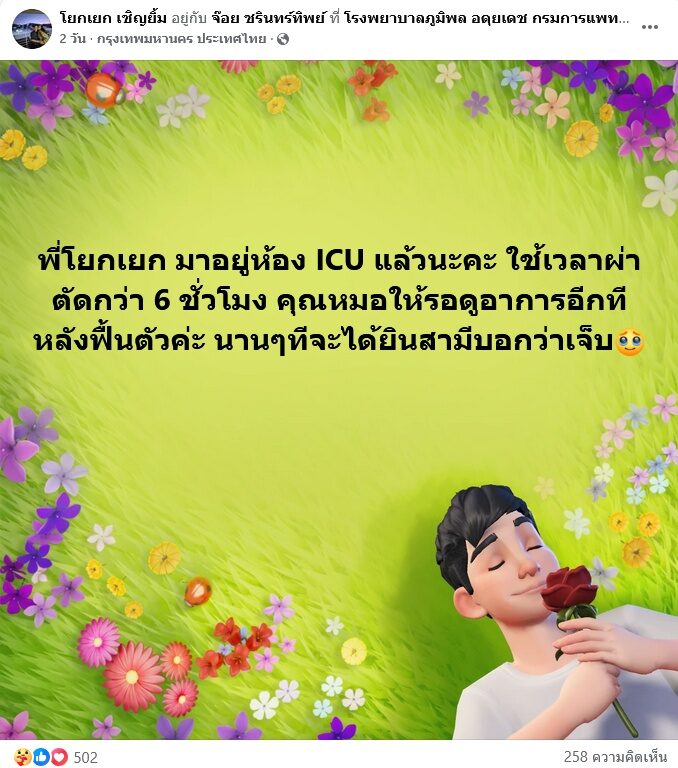 จากกรณีก่อนหน้านี้ จ๊อย ชรินทร์ทิพย์ ภรรยาตลกดังโพสต์แจ้งข่าว โยกเยก เชิญยิ้ม ว่า “พี่โยกเยก มาอยู่ห้อง ICU แล้วนะคะ ใช้เวลาผ่าตัดกว่า 6 ชั่วโมง คุณหมอให้รอดูอาการอีกทีหลังฟื้นตัวค่ะ นานๆทีจะได้ยินสามีบอกว่าเจ็บ”
