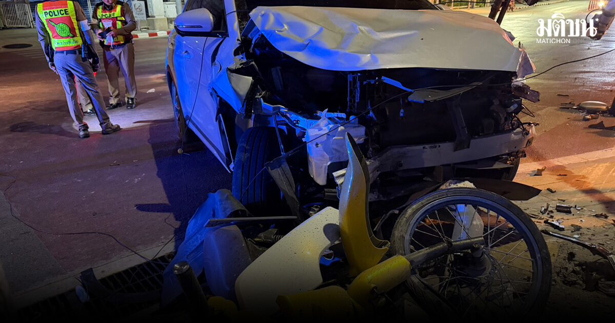หนุ่มขับรถยนต์ไฟฟ้า ไม่เบรกพุ่งเสยท้ายรถจยย.จอดติดไฟแดง ลากครูดไถลกลางห้าแยกวัชรพล ชายคนขี่เจ็บสาหัส หญิงซ้อนท้ายร่างกระเด็นดับสลด คู่กรณียกมือไหว้ “ ผมขอโทษ ผมหลับใน ”