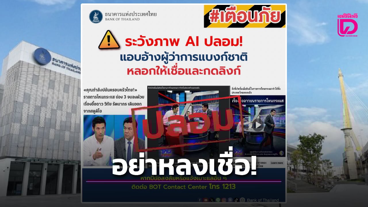 แบงก์ชาติ ระบุว่า ธนาคารแห่งประเทศไทย (ธปท.) ขอแจ้งข่าวปลอม ที่ไม่เป็นความจริง แอบอ้างรายการโหนกระแส และเพจไทยรัฐออนไลน์ โดยใช้ AI สร้างรูป นายวิทัย รัตนากร ผู้ว่าการ ธปท. ขึ้นมา ขอให้ประชาชนอย่างหลงเชื่อ