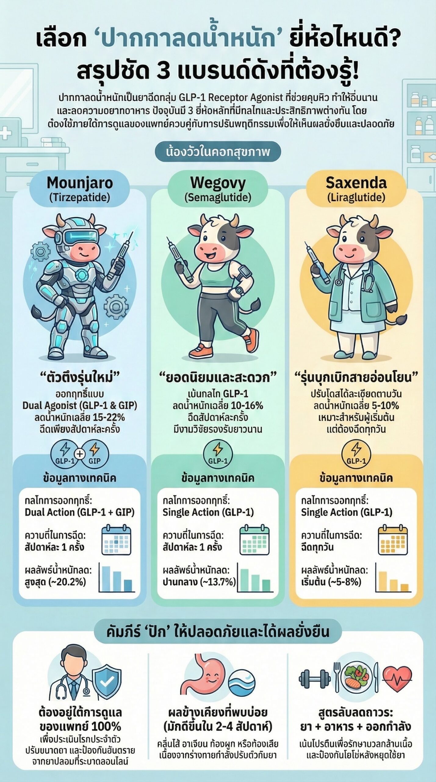 Meta Description: ปากกาลดน้ำหนักทำงานอย่างไร? เปรียบเทียบ 3 แบรนด์ดัง Mounjaro, Wegovy, Saxenda แตกต่างกันตรงไหน พร้อมคัมภีร์การใช้ให้ปลอดภัย ไม่โยโย่ อ่านเลยที่ Moo-Moo News