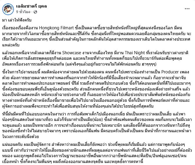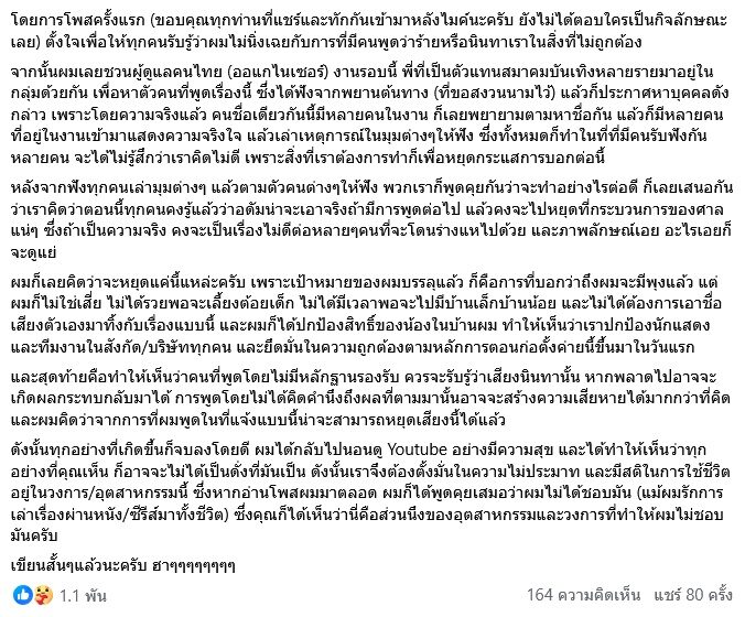 “ผมถึงต้องออกมาแสดงจุดยืน และหยุดยั้งการครหานี้โดยการโพสครั้งแรก (ขอบคุณทุกท่านที่แชร์และทักกันเข้ามาหลังไมค์นะครับ ยังไม่ได้ตอบใครเป็นกิจลักษณะเลย) ตั้งใจเพื่อให้ทุกคนรับรู้ว่าผมไม่นิ่งเฉยกับการที่มีคนพูดว่าร้ายหรือนินทาเราในสิ่งที่ไม่ถูกต้อง”