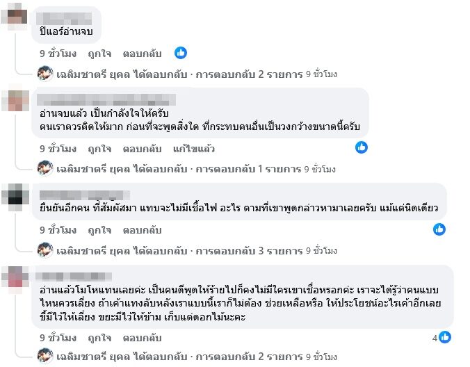 โดยคอมเมนต์ต่างเข้ามาให้กำลังใจ พร้อมทั้งบอกว่าร้ายแรงมาก การใส่ร้ายคนอื่นเป็นเมียน้อยจนเสื่อมเสีย พร้อมทั้งบอกอย่าไปสนใจปากคน