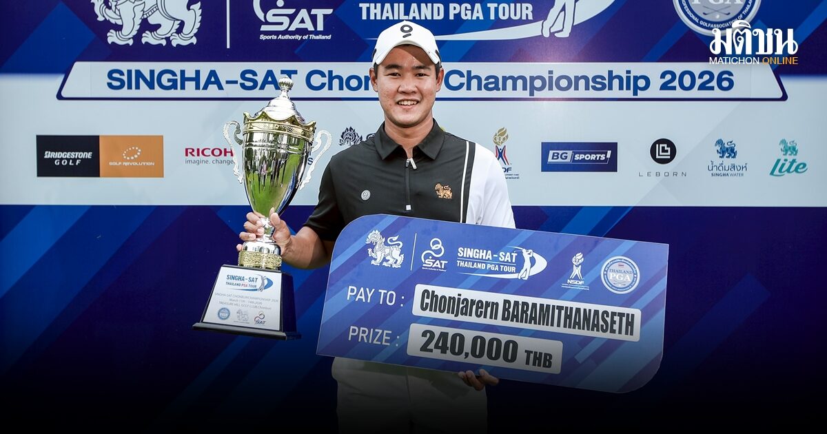 “โปรนก” ชนม์เจริญ บารมีธนเศรษฐ์ วัย 25 ปีจากชัยนาท พัตต์เบอร์ดี้ระยะ 25 ฟุตที่หลุมแรกของการเพลย์ออฟ เฉือนชนะ ทัตพงศ์ ชุติมาภรณ์ คว้าแชมป์ไทยแลนด์พีจีเอทัวร์ นัดเปิดฤดูกาล 2026 ในศึกกอล์ฟ สิงห์-เอสเอที ชลบุรี แชมเปี้ยนชิพ 2026 ชิงเงินรางวัลรวม 2 ล้านบาท ที่สนามเทรชเชอร์ฮิลล์ กอล์ฟ คลับ จ.ชลบุรี