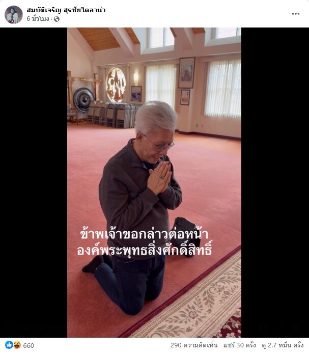 วันนี้ (20 มี.ค.69) สุรชัย สมบัติเจริญ ได้โพสต์ คลิป ไปวัดพร้อมทั้งยกมือไหว้สวดมนต์ต่อหน้าพระพุทธรูป พร้อมกล่าวอธิษฐาน โดยพูดถึง ร็อคกี้ ด้วยว่า