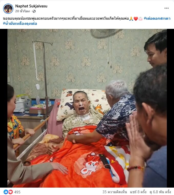 ทั้งนี้เมื่อเจอหน้าตลกอาวุโส ชมพู่ ก็สวัสดีและทักทาย “คิดถึงจังเลย” พร้อมทั้งจับมือให้กำลังใจ ทำเอา เด๋อ ดอกสะเดา ร้องไห้หนักด้วย โดยทุกคนก็อวยพรวันเกิด พร้อมทั้งให้กำลังใจด้วย โดยสาวชมพู่ก็บอกว่า “เพิ่งไปกายภาพมาใช่มั้ย เดี๋ยวก็หายดีแล้ว รีบไปร้องเพลง พ่อรอร้องเพลงอยู่นะ”