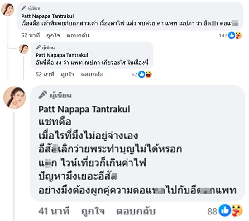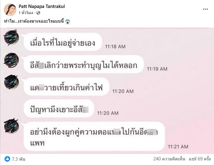 โดย แพท สรุปที่โพสต์ไปด้วยว่า “เรื่องคือ เค้าพิมพ์คุยกับลูกสาวเค้า เรื่องค่าไฟ แล้ว จบด้วย ด่า แพท ณปภา ว่า อีดxx ตอแxx อันนี้คือ งง ว่า แพท ณปภา เกี่ยวอะไร ในเรื่องนี้”