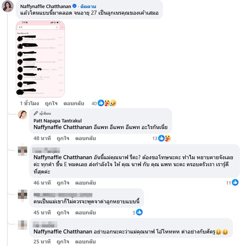 ขณะที่ นาฟ ฉัฐนันท์ ผู้ซึ่งคือลูกสาวในแชท ก็เผยแชทคำด่าทออีกมากมายของแม่ใต้โพสต์ของแพท พร้อมทั้งคอมเมนต์ด้วยว่า “แล้วโดนแบบนี้มาตลอด จนอายุ 27 เป็นลูกเนรคุณของเค้าเสมอ”