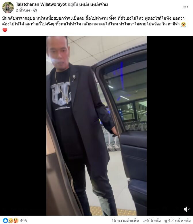 “บินกลับมาจากอุบล หน้าเหนื่อยบอกว่าจะเป็นลม ดื้อไปทำงาน ทั้งๆ ที่ตัวเองไม่ไหว พูดอะไรก็ไม่ฟัง บอกว่าต้องไปให้ได้ สุดท้ายก็ไปจริงๆ ทิ้งหนูไปทำไม กลับมาหาหนูได้ไหม ทำไมเราไม่ตายไปพร้อมกัน สามีจ๋า”
